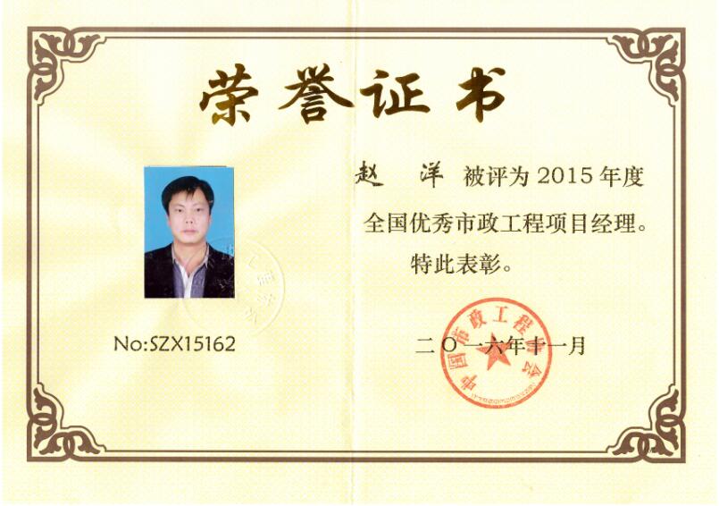 昨日,安徽省市政工程協(xié)會九屆三次理事會議在廬江召開,我公司趙洋同志榮獲“2015年度全國優(yōu)秀市政工程項目經(jīng)理”稱號,全省僅有十二位同志獲得此項殊榮。會上,省協(xié)會主要領導對獲獎者頒發(fā)了榮譽證書。