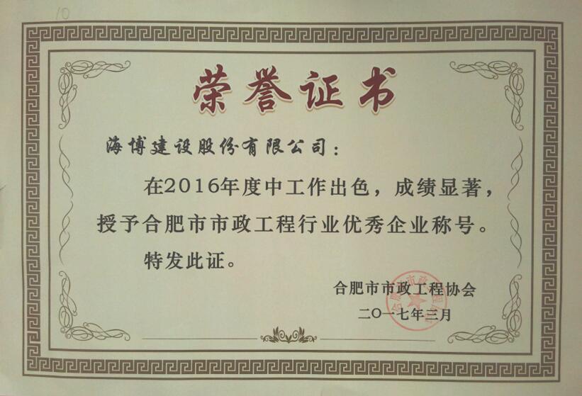 會議對榮獲2016年度合肥市市政工程優(yōu)秀企業(yè)、優(yōu)秀項目經(jīng)理進行了表彰,78家會員單位獲得“市政工程優(yōu)秀企業(yè)”證書,174名項目經(jīng)理獲得“市政工程優(yōu)秀項目經(jīng)理”證書。我公司獲得“市政工程優(yōu)秀企業(yè)”榮譽,望江西路(將軍嶺路-新橋大道)建設工程二標獲得“市政工程安全質(zhì)量標準化示范工地”榮譽,呂偉、孫斌、王鎮(zhèn)華等三人獲得“優(yōu)秀項目經(jīng)理”榮譽。