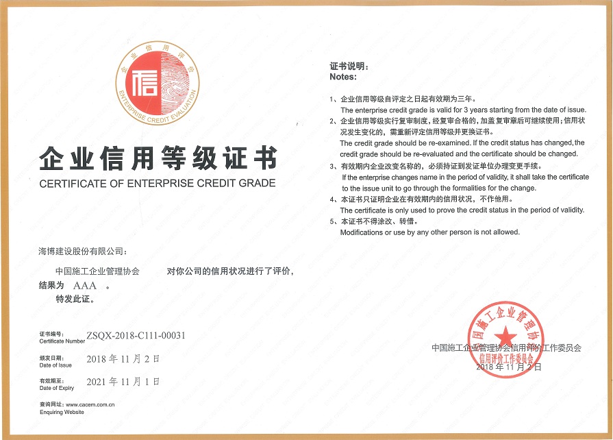 12月4日,從中國施工企業管理協會在北京召開的“2018年工程建設誠信企業推介大會”上傳來喜訊,在2018年度工程建設企業信用評價工作中,我司信用等級被評定“AAA”級,這是繼水利部給予評定的“AAA”級之后,榮獲的第二項國家主管行業協會頒發的信用等級證書。