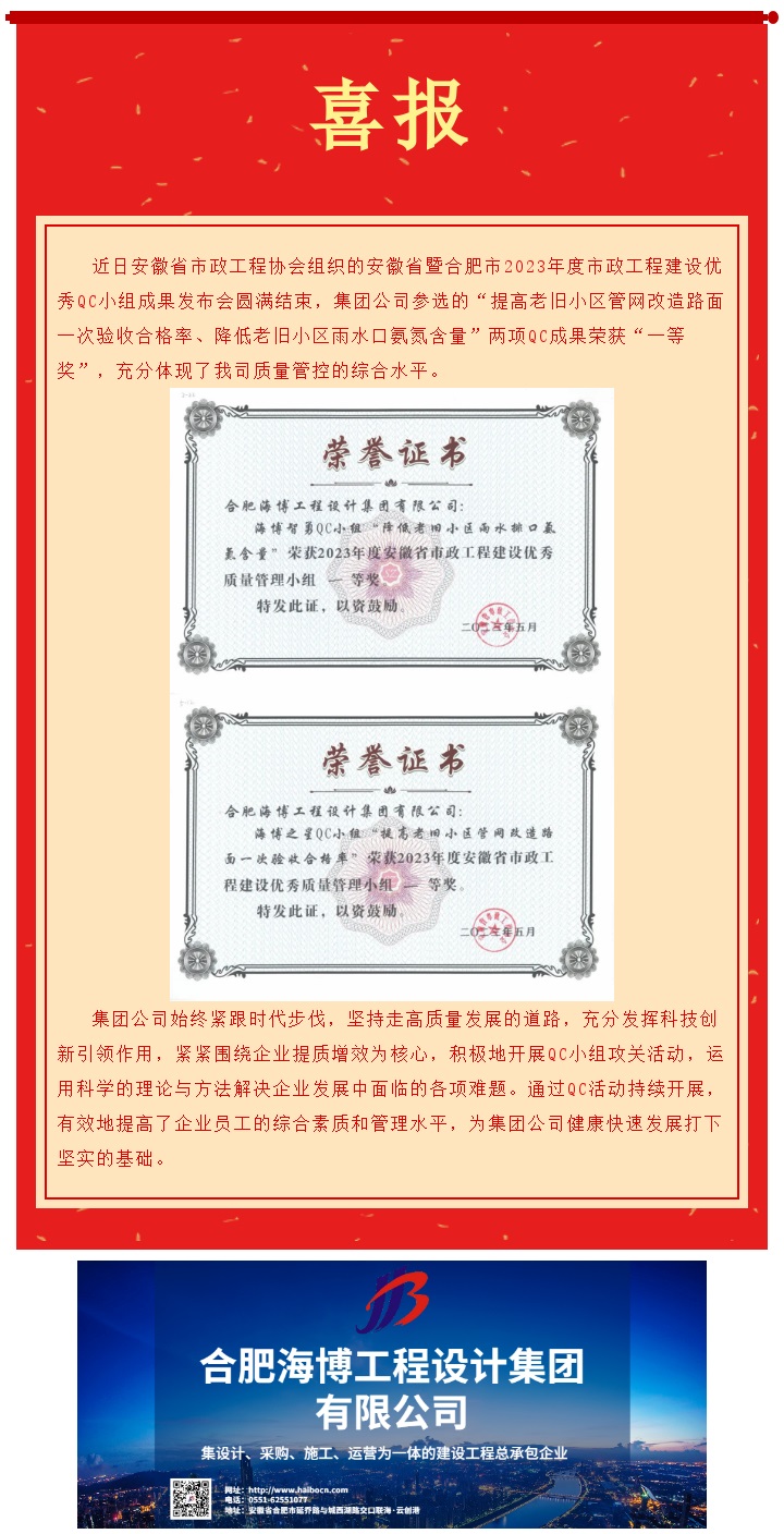 海博集團(tuán)獲安徽省市政工程建設(shè)QC小組成果一等獎(jiǎng)